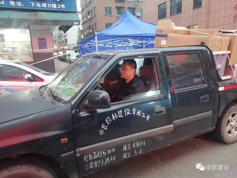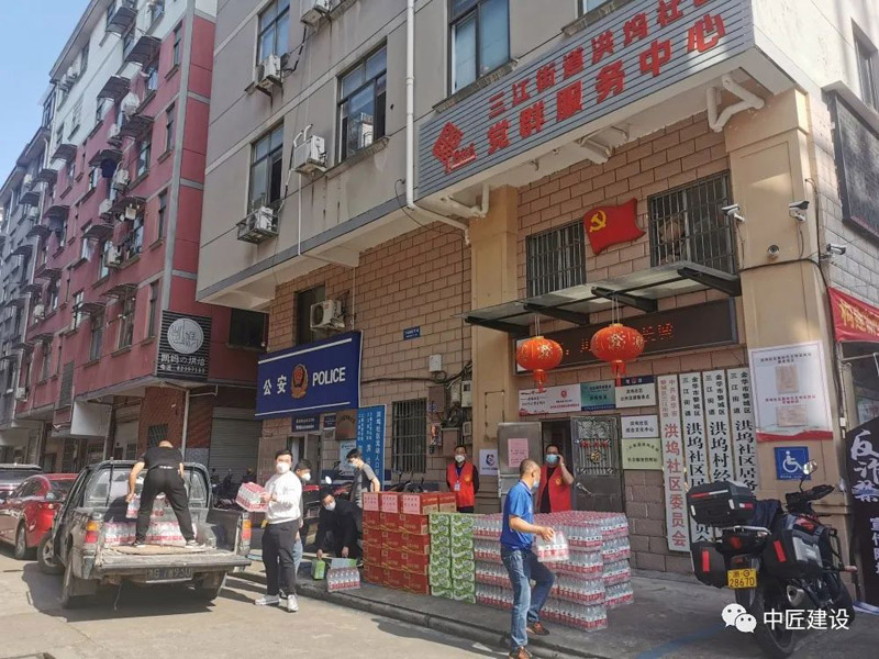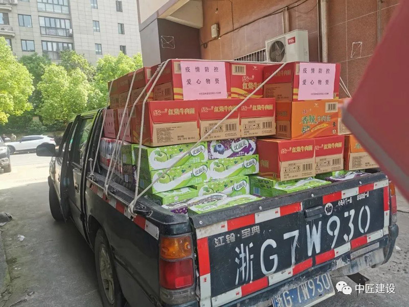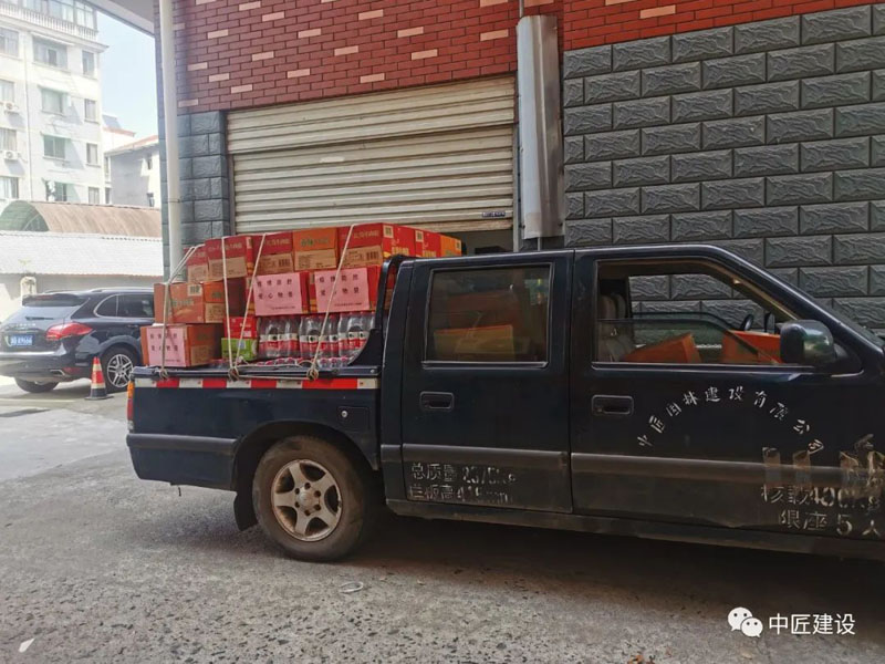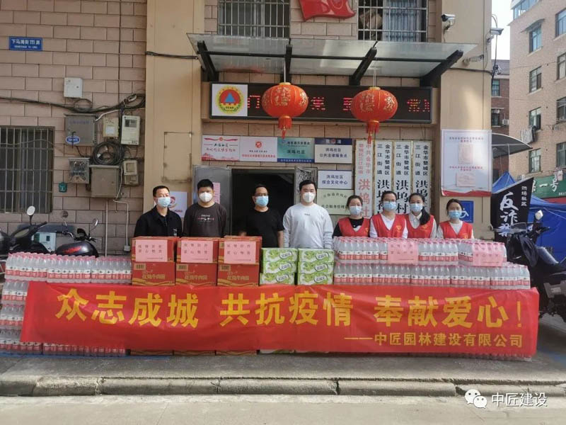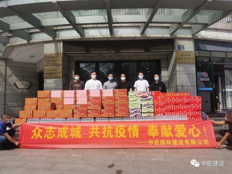 4月21日下午,中匠園林建設有限公司占旭君董事長帶領副總經理金立勤、孫忠華等公司骨干人員,滿載著牛奶、礦泉水、八寶粥、方便面等物資,前往三江街道和洪塢社區慰問堅守在疫情一線的抗疫人員,為打贏這場疫情防控狙擊戰盡一份綿薄之力。