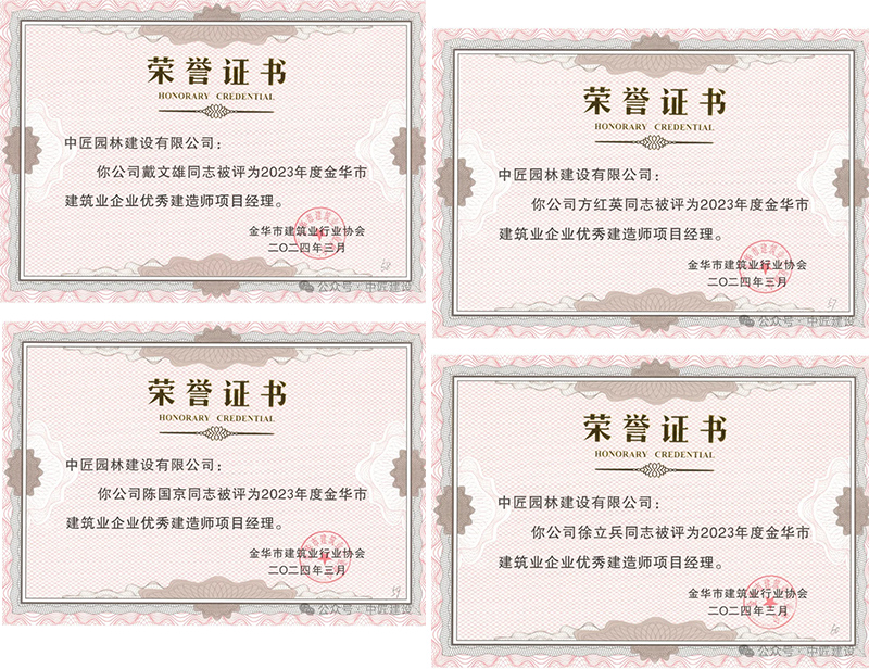 At the same time, the outstanding talents of the company have also received the recognition they deserve. Dai Wenxiong, Fang Hongying, Chen Guojing, and Xu Libing, four outstanding project managers, were awarded the title of Outstanding Construction Engineer Project Manager in Jinhua City's construction industry in 2023 for their outstanding leadership and project management abilities.